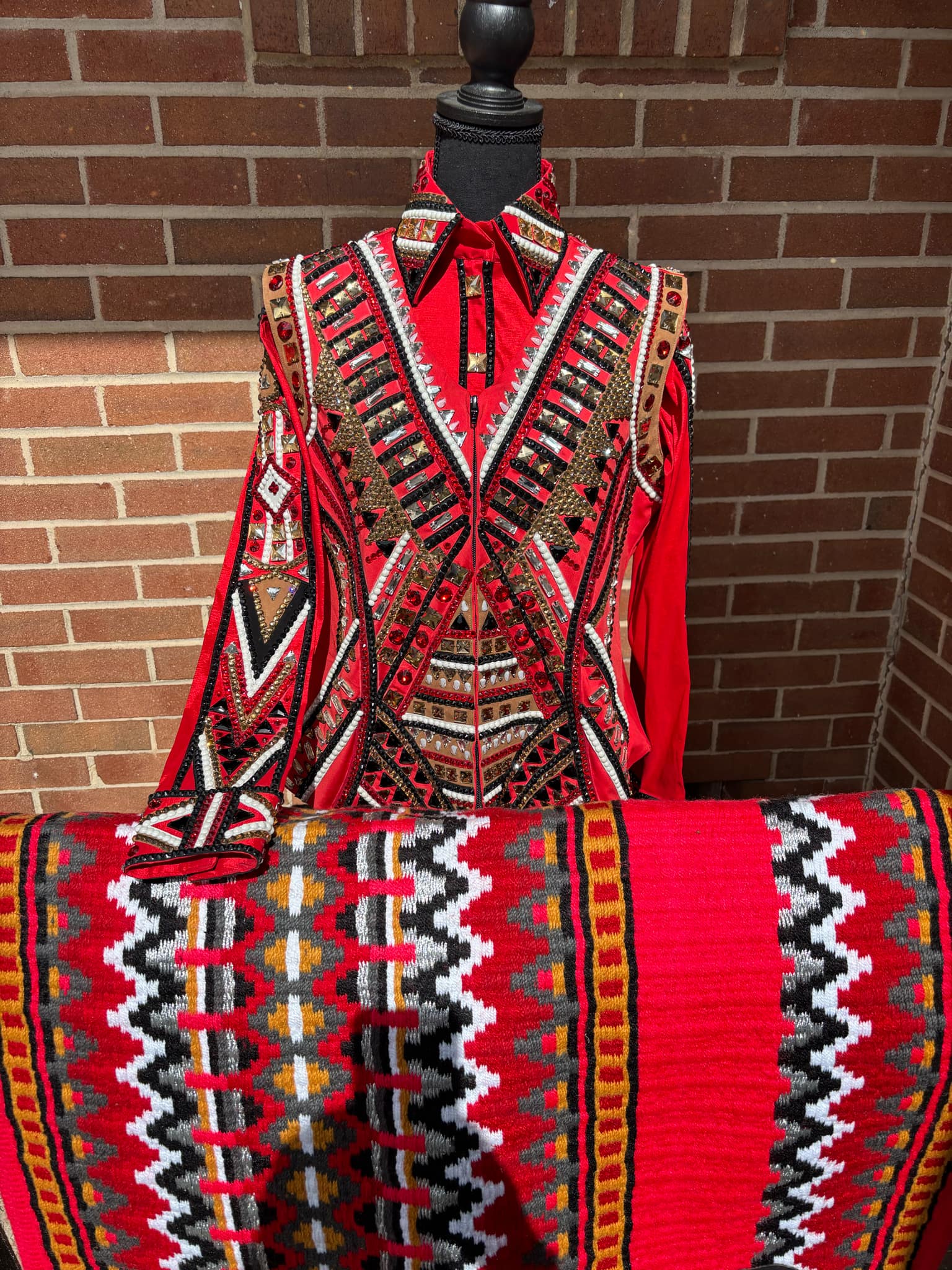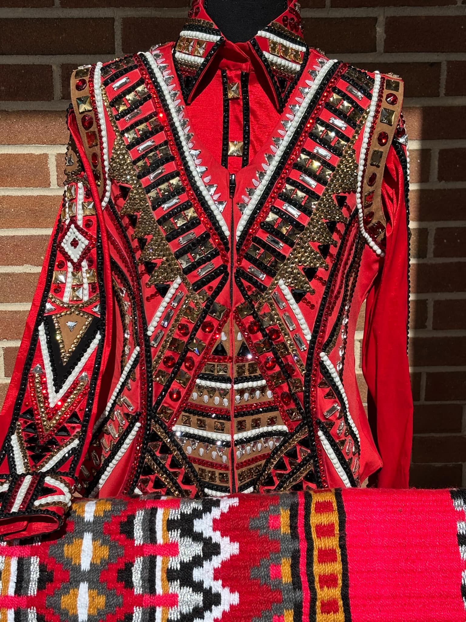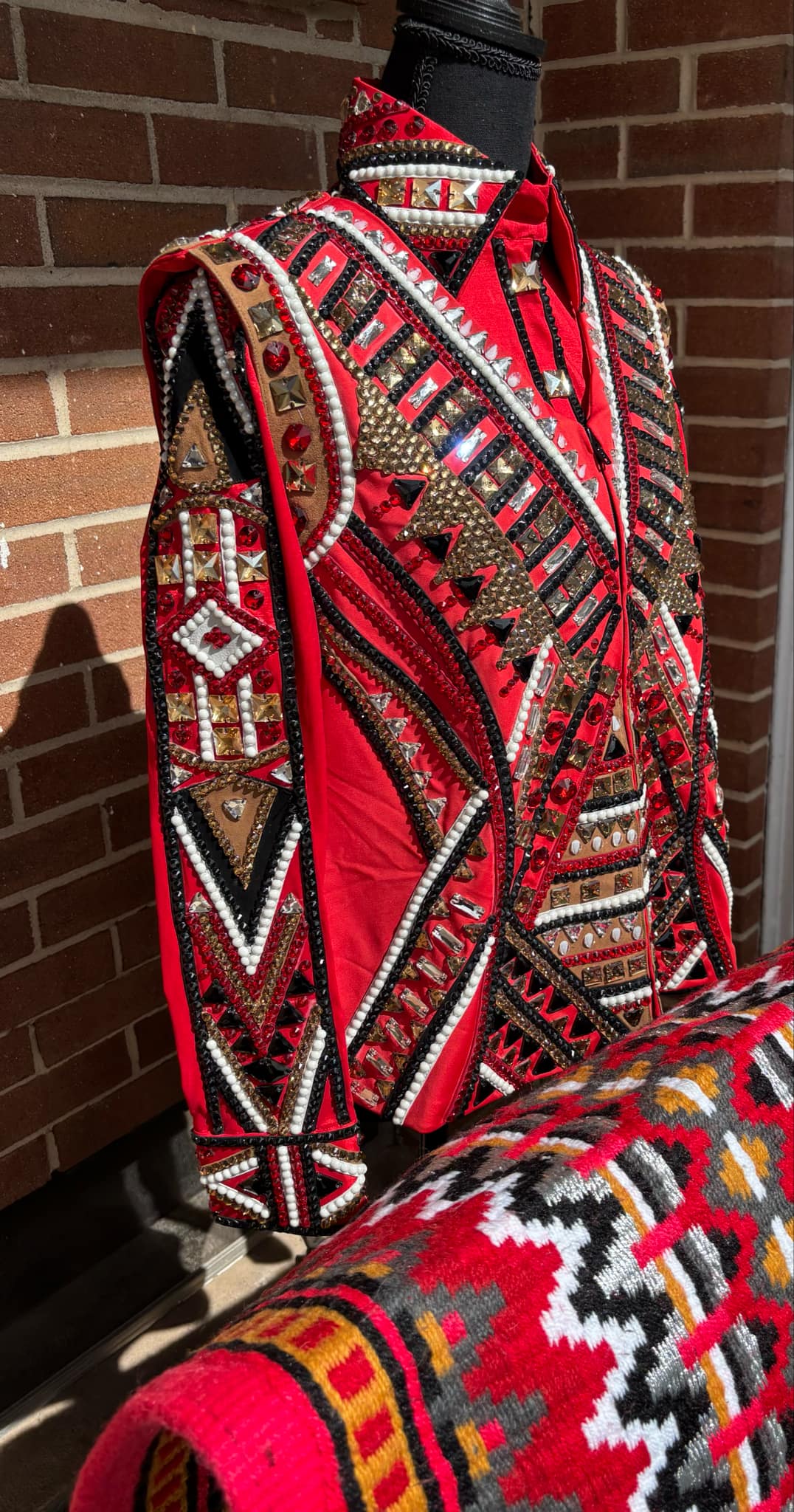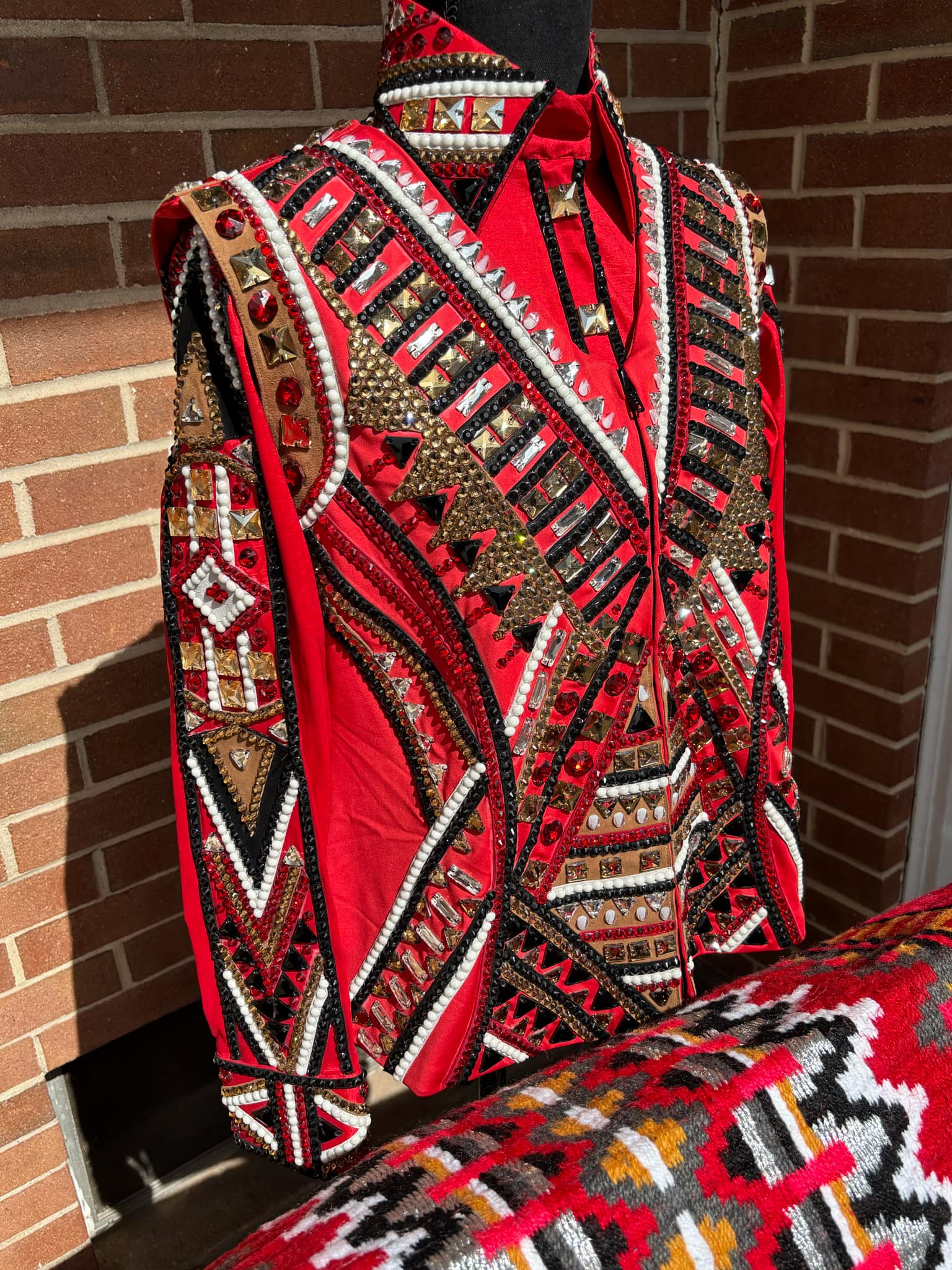 Expertly crafted from luxurious taffeta fabric, this beautiful red show shirt is perfect for completing your equestrian look. The vibrant red color adds a bold touch, while the material ensures both comfort and style in the ring. Make a statement with this matching shirt, vest, and pad set.