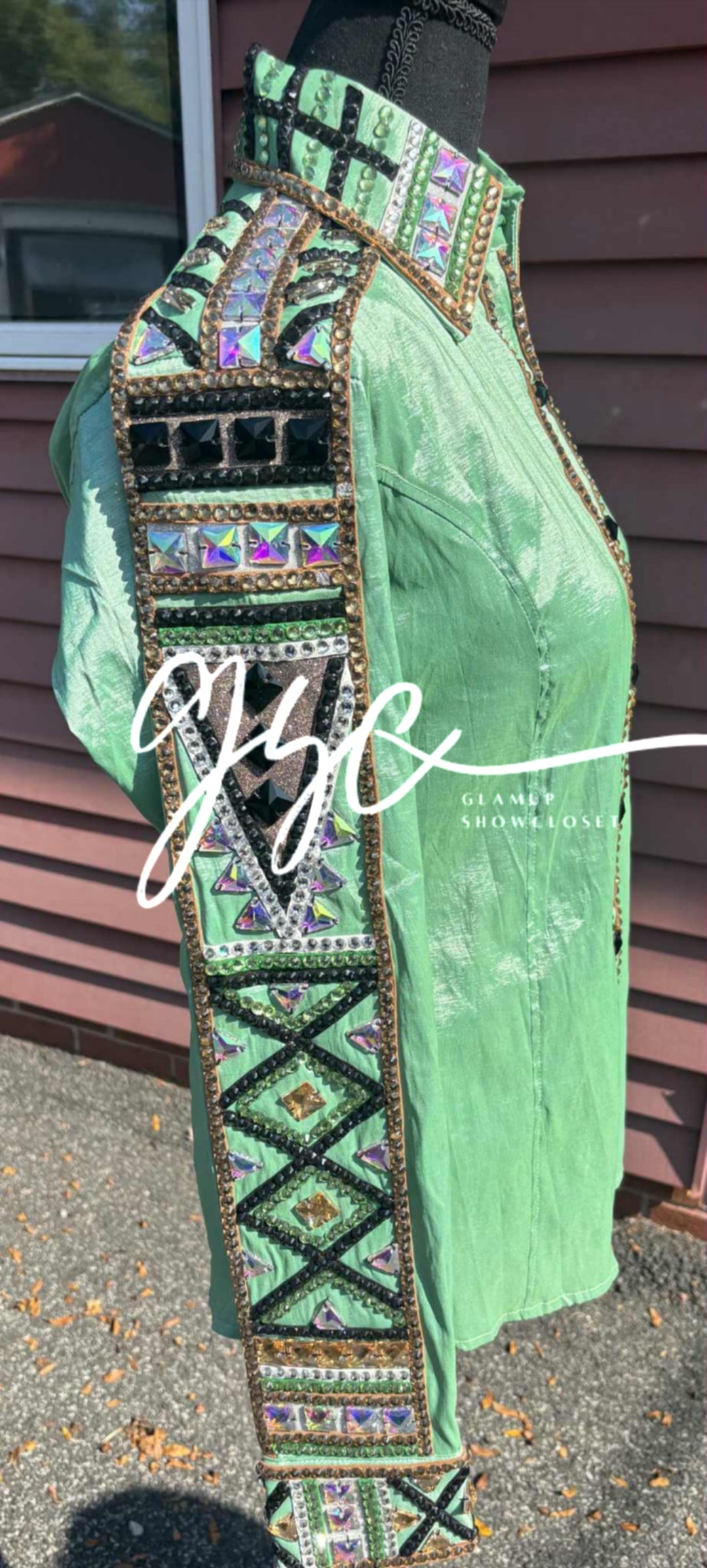 The collar, front placket and FULL sleeve are fully embellished with a stunning combination of geometric patterns, sparkling rhinestones, and metallic accents in gold and silver tones.