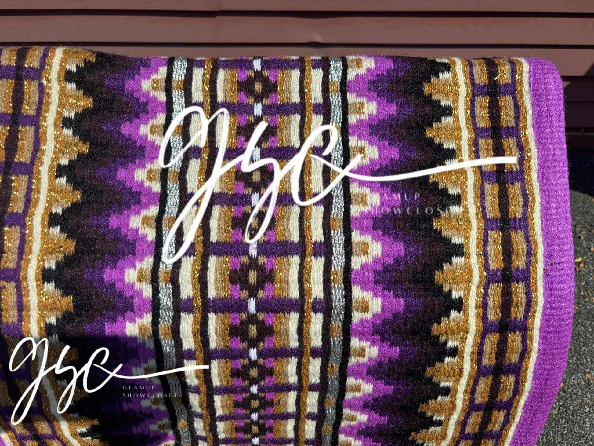Stretch Taffeta Day Shirt - Purple base fabric with black, white, gold & silver embellishments. This material is breathable and has approximately up to 2" of stretch. Our high attention to quality stitching and applique and stone placement is second to none.